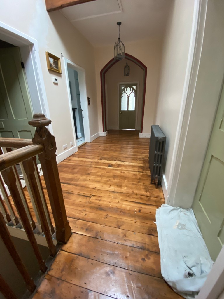 A view of the top landing in the main part of the house. The floor has just been waxed. The banister is still in the process of being restored. It has had several coats of paint removed.