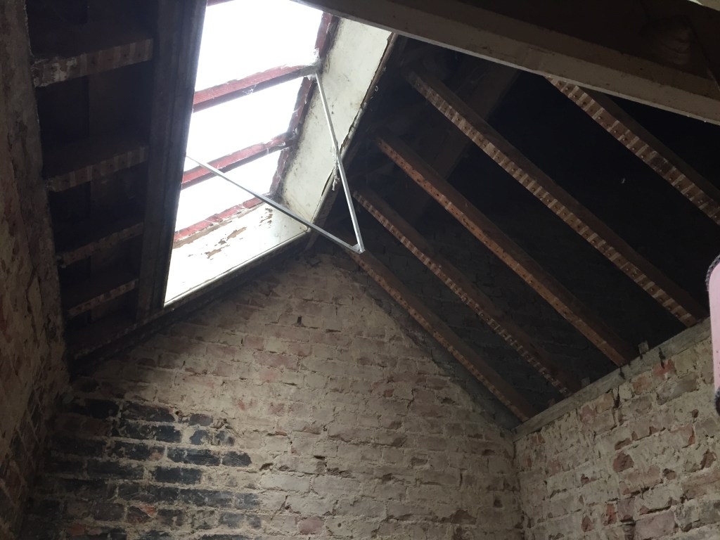 - There is a rather large single glazed skylight at the highest point in the stairwell. This has been removed when the new roof was installed and a triple glazed Velux has been inserted on this side of the beam, far easier for maintenance.