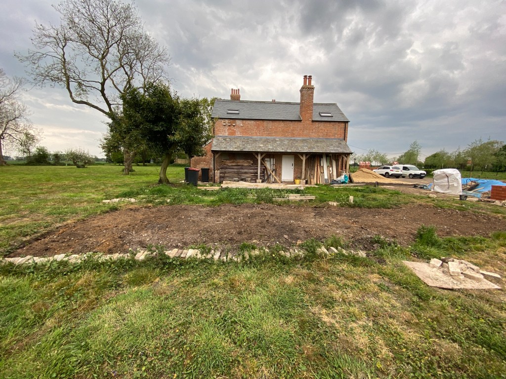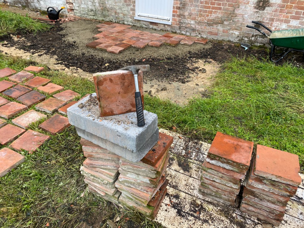 - The old scullery and pantry tiles where possible were saved and are being laid as a patio area. This is not quite finished in this photo, the step and the left and right wings still need to be laid.