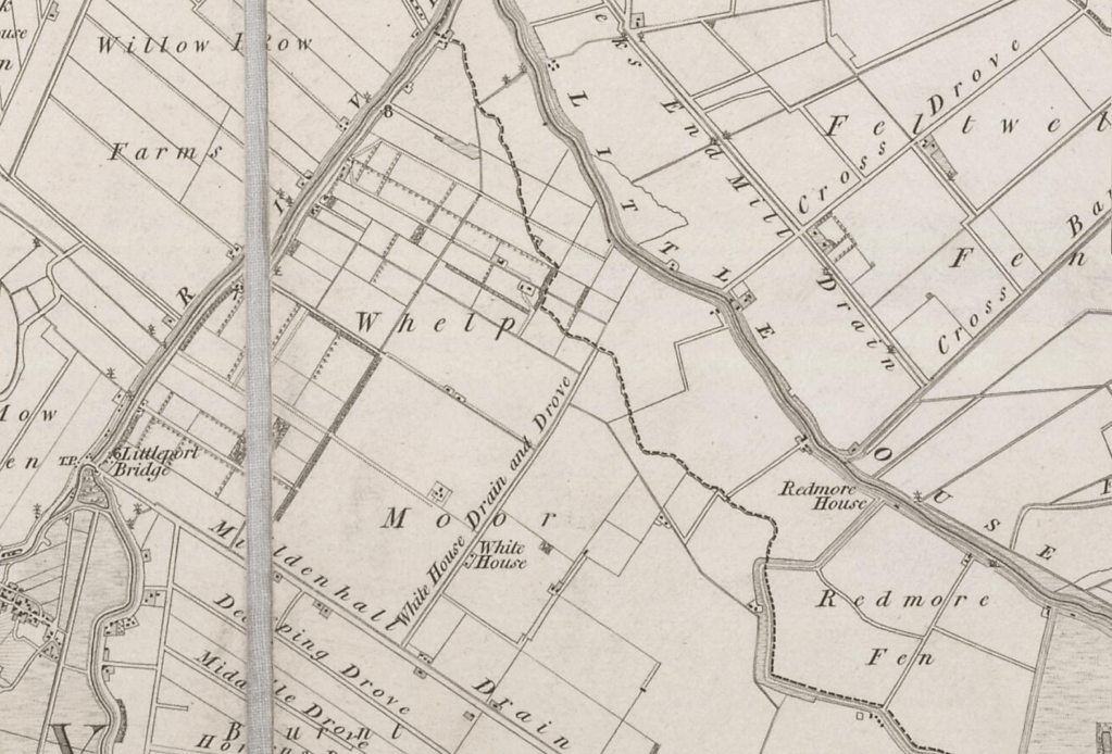 On this 1824 map Mildenhall Drain runs quite clearly on or alongside what would now be the Mildenhall Road. On later maps it is placed half-way down White House Road.