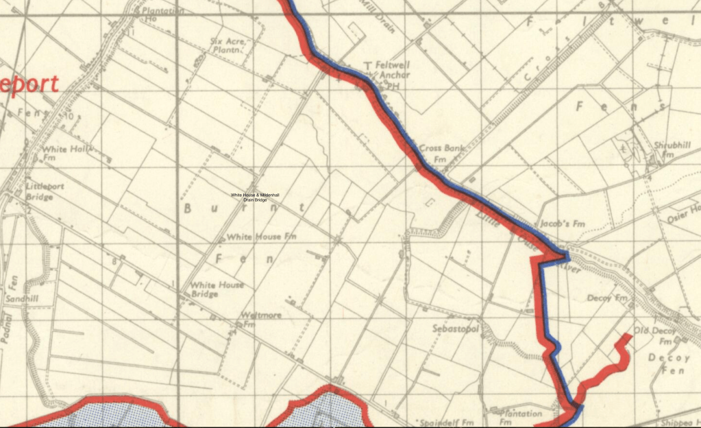 If you look above the Wording Burnt Fen, I have marked the bridge on the map. This map shows the bridges over the drainage channels.